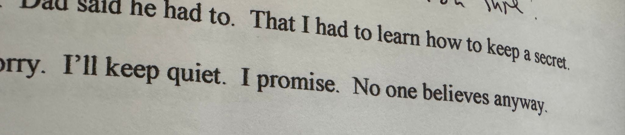 “I’ll keep quiet. I promise. No one believes anyway.”